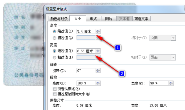 1、在图片上右键,设置大小--长8.56cm、宽5.4cm。